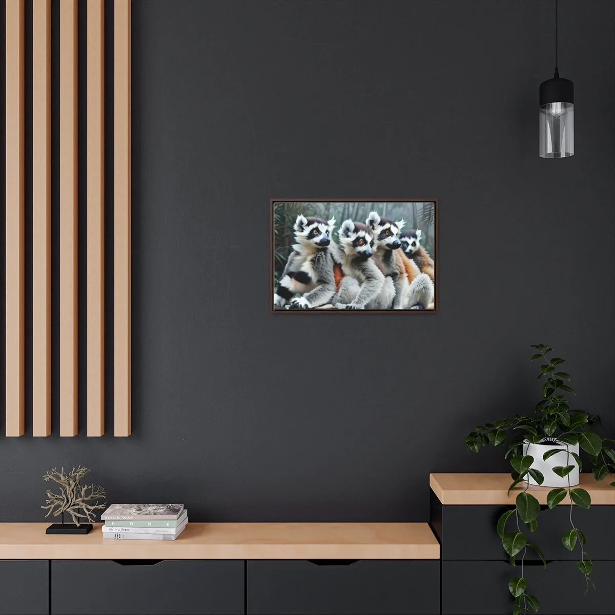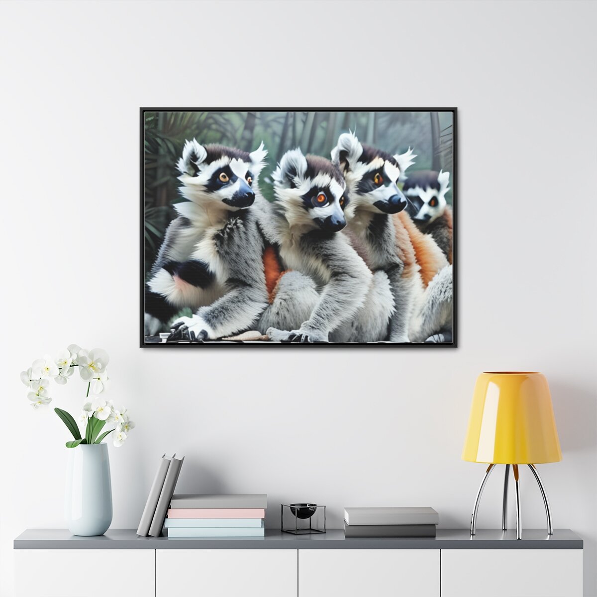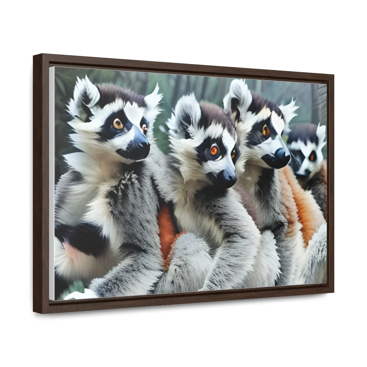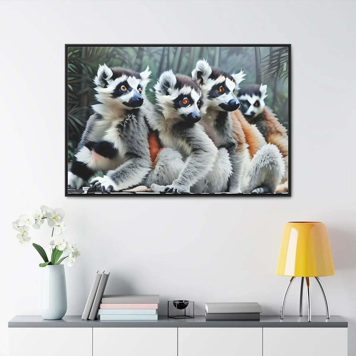 The Lemur Gang watercolor image will give any room a bit whimsical flair, and style. It's not something you are going to see every day. This horizontal gallery wrapped canvas print will always look as tight and flat as the day it was made. Every frame is built with a solid face to support the canvas and prevent deforming. Available in multiple sizes, comes in walnut and black frame options.