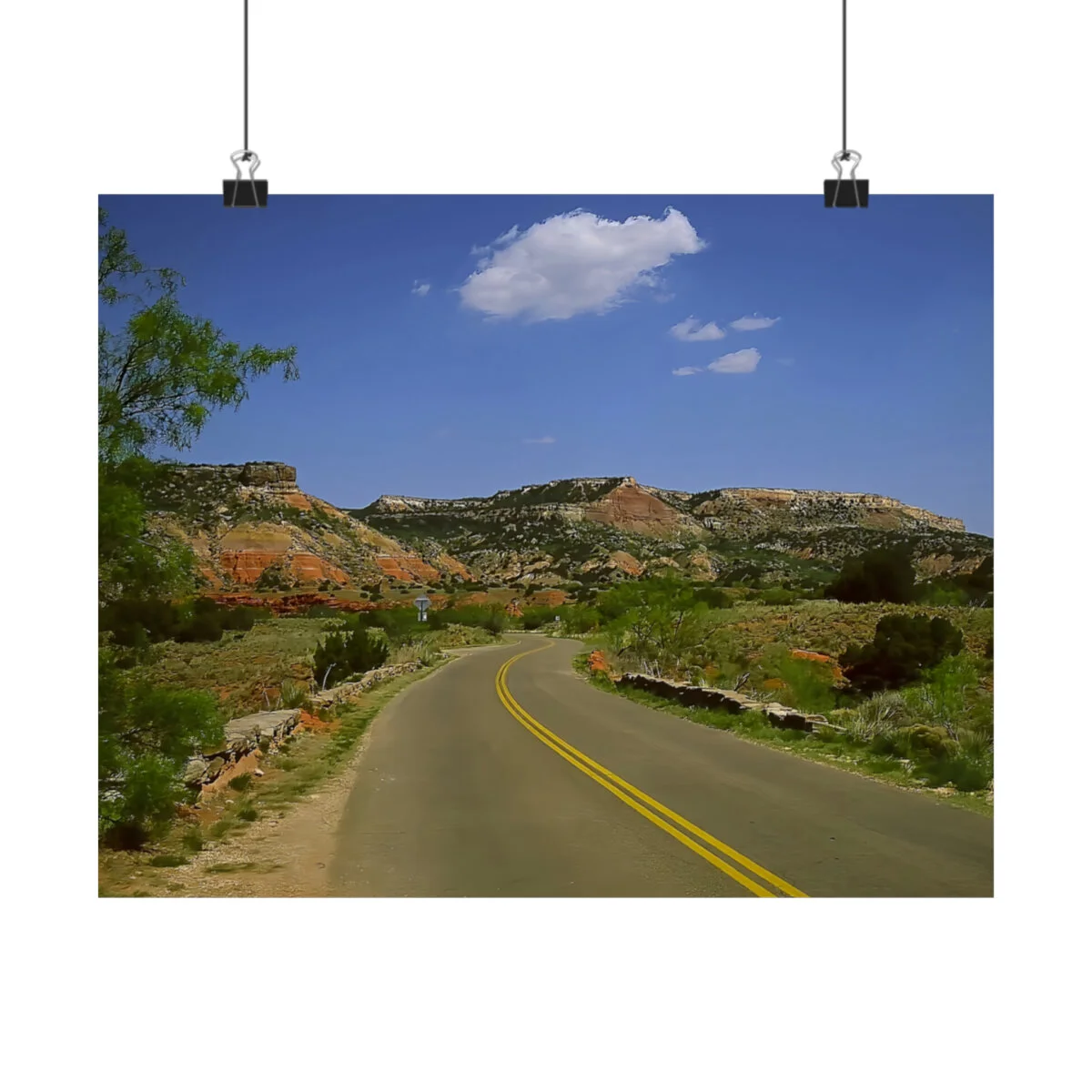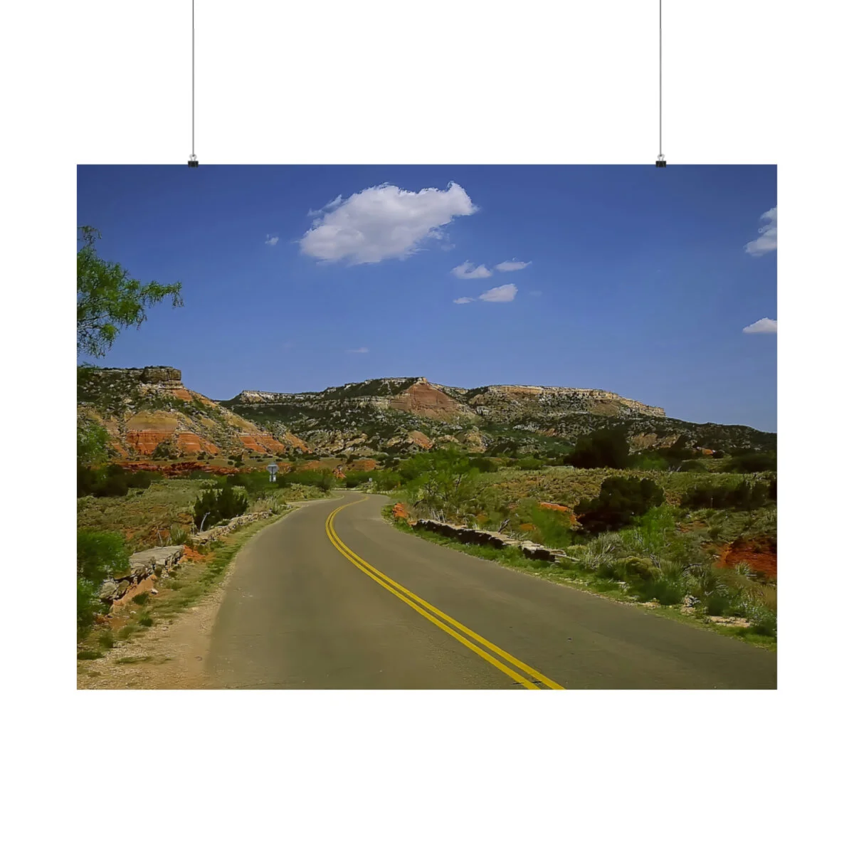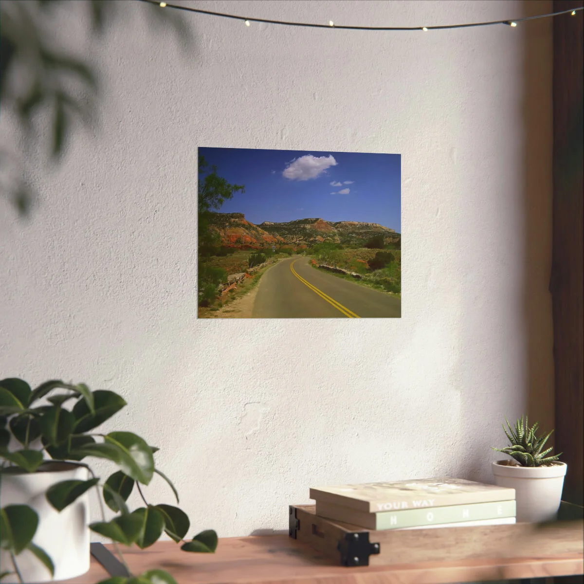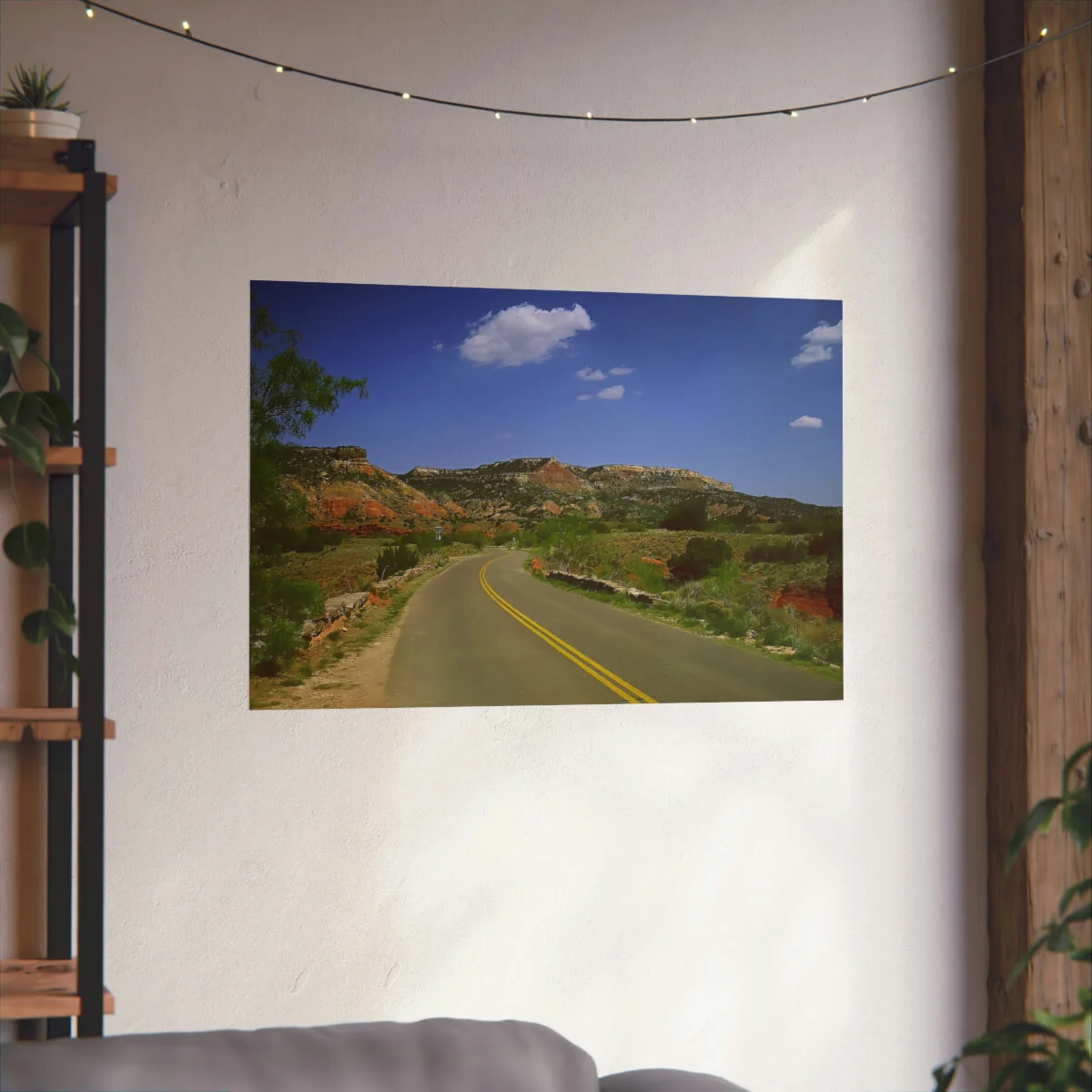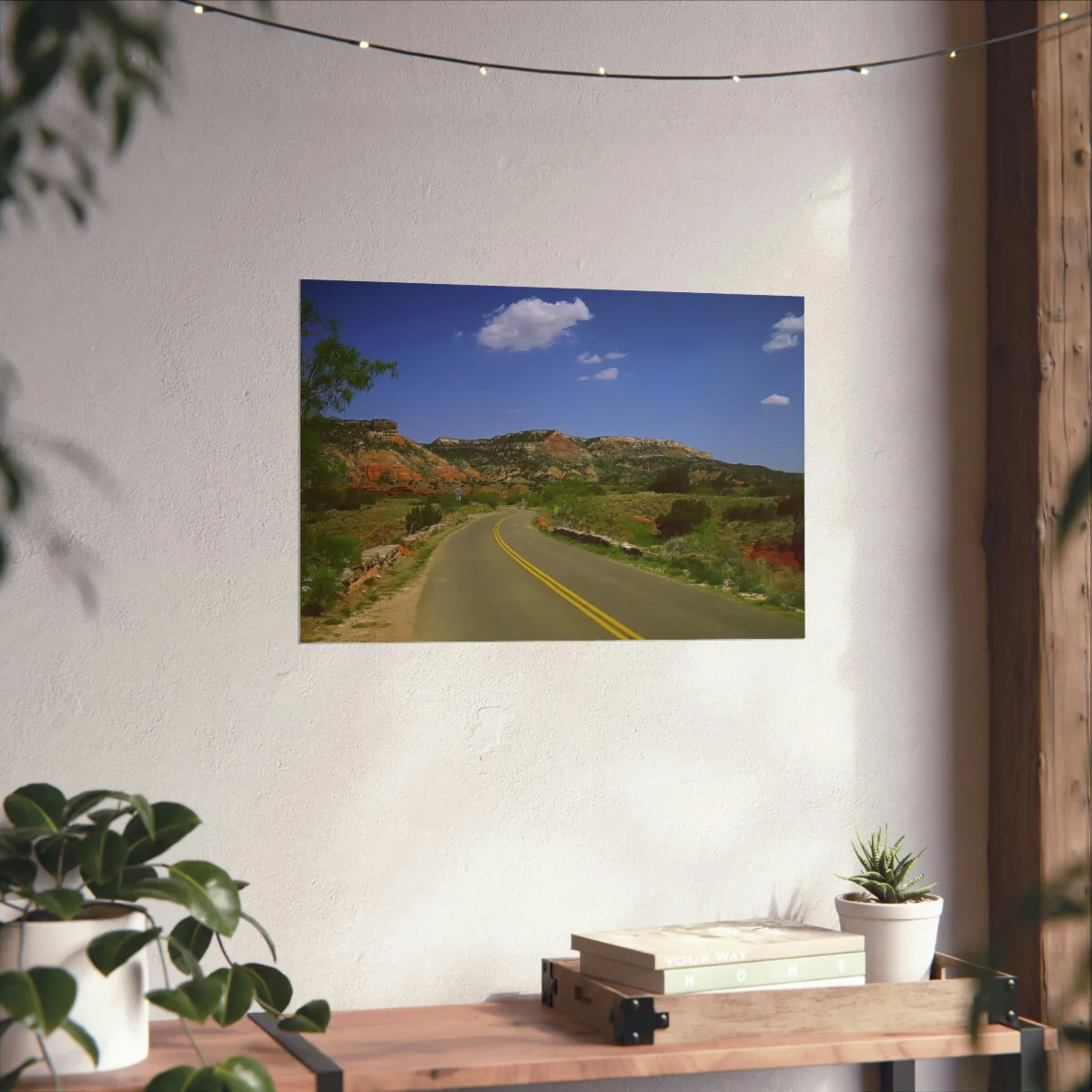 The Road To Palo Duro Canyon photo shows the captivating beauty of the terrain and blue sky of the road entering Palo Duro Canyon, in the Texas Panhandle. This premium matte horizontal poster is made with museum-grade paper (175gsm fine art paper). Available in multiple sizes, each poster is printed with top-tier pigmented archival inks for excellent printing results.