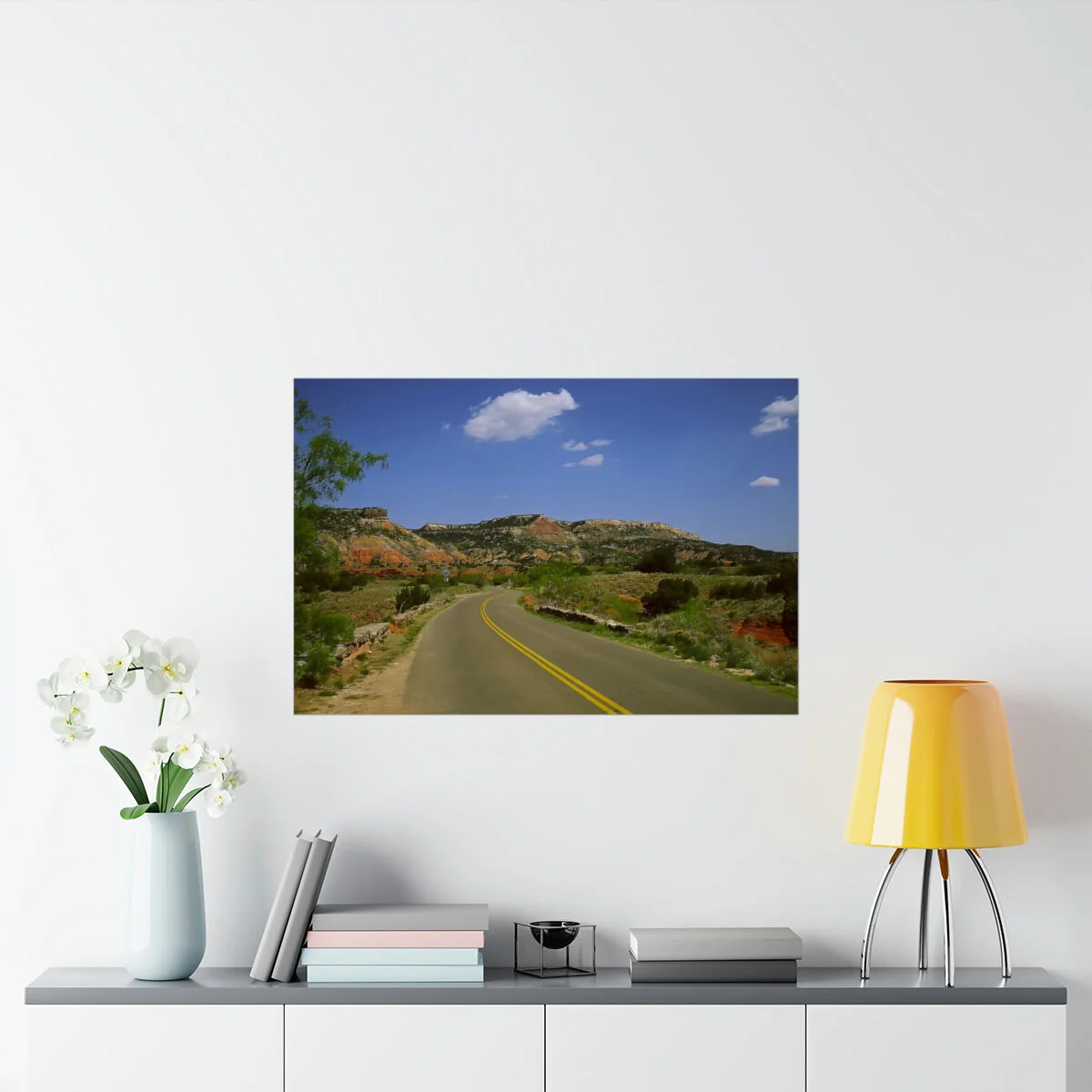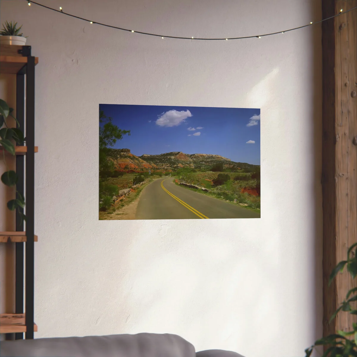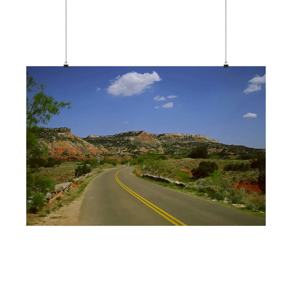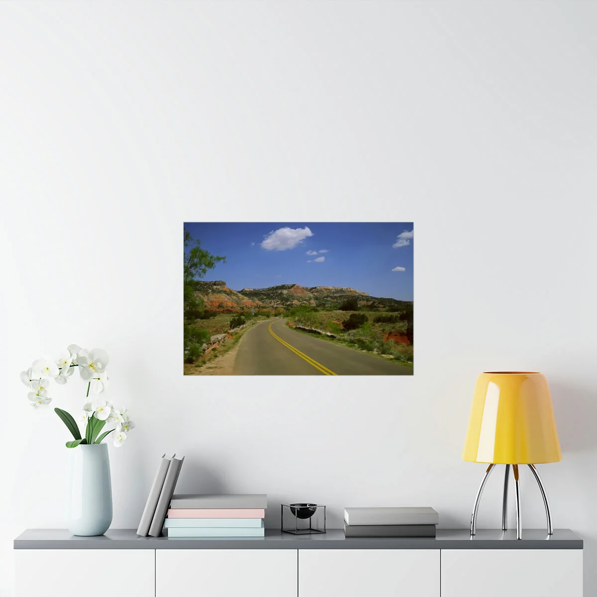 The Road To Palo Duro Canyon photo shows the captivating beauty of the terrain and blue sky of the road entering Palo Duro Canyon, in the Texas Panhandle. This premium matte horizontal poster is made with museum-grade paper (175gsm fine art paper). Available in multiple sizes, each poster is printed with top-tier pigmented archival inks for excellent printing results.