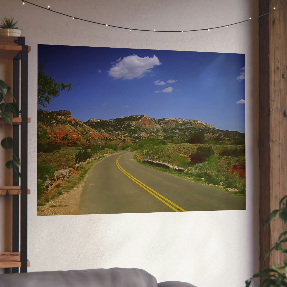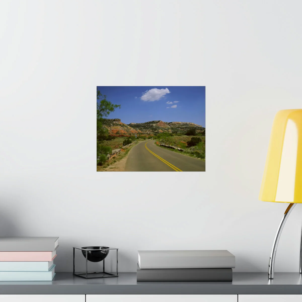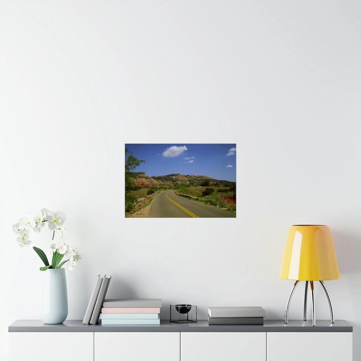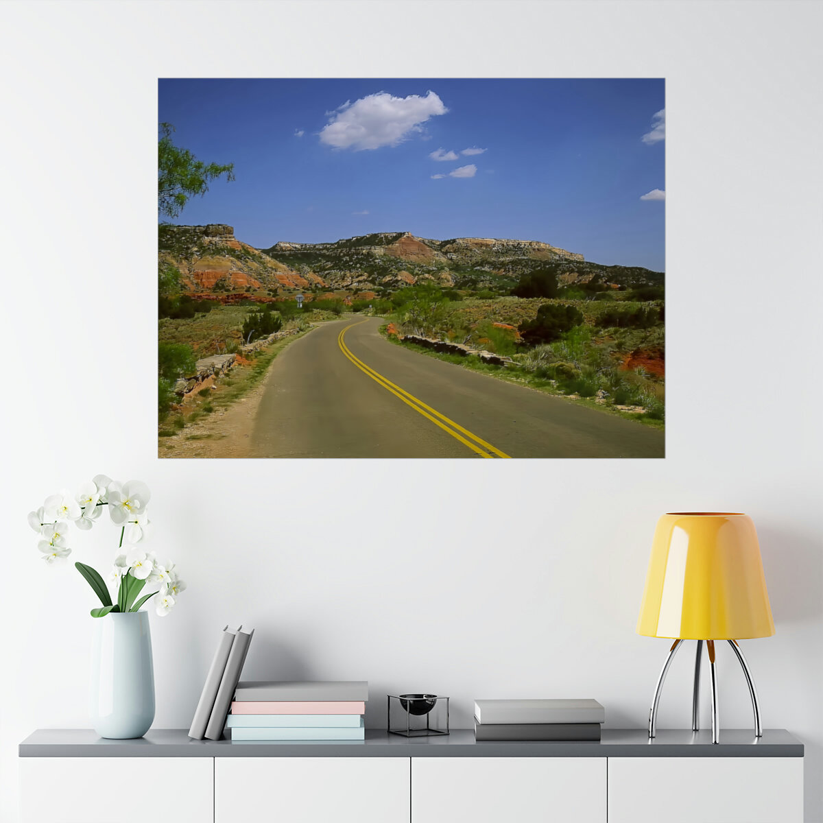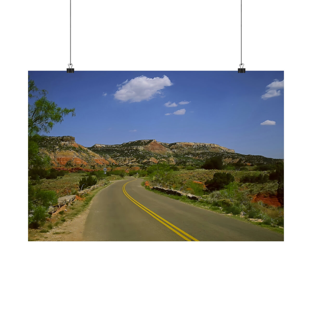 The Road To Palo Duro Canyon photo shows the captivating beauty of the terrain and blue sky of the road entering Palo Duro Canyon, in the Texas Panhandle. This premium matte horizontal poster is made with museum-grade paper (175gsm fine art paper). Available in multiple sizes, each poster is printed with top-tier pigmented archival inks for excellent printing results.