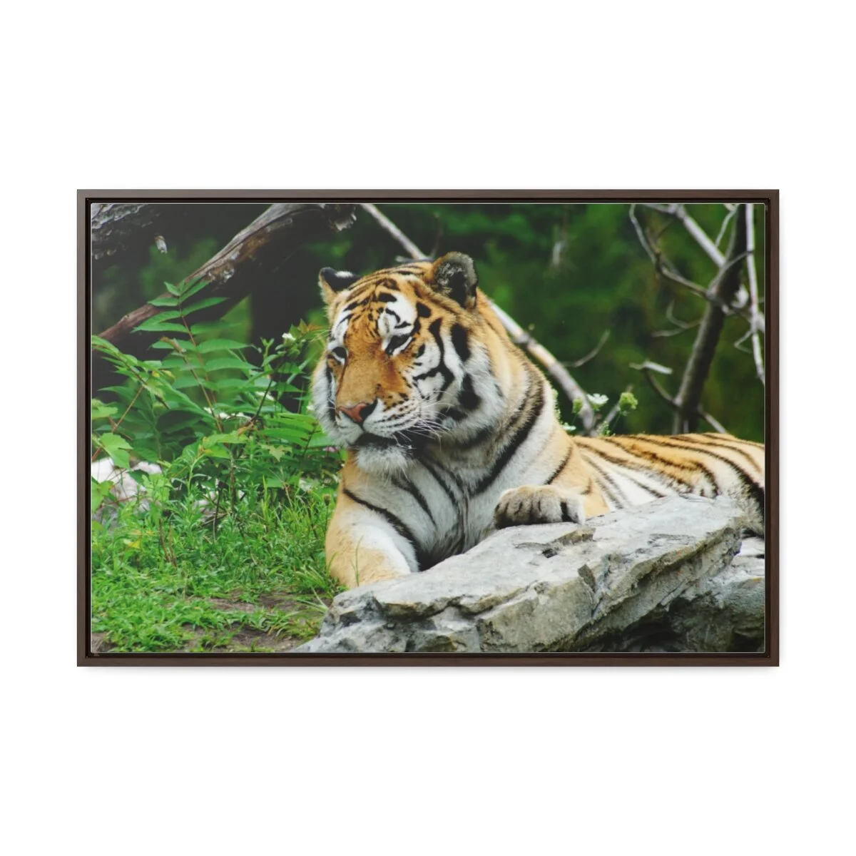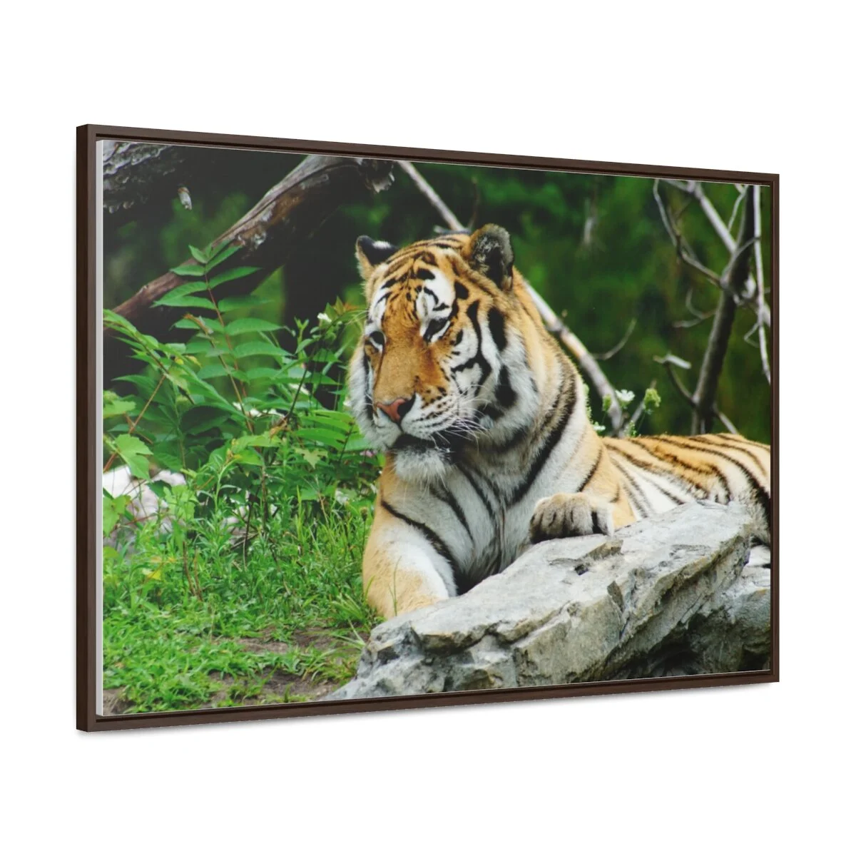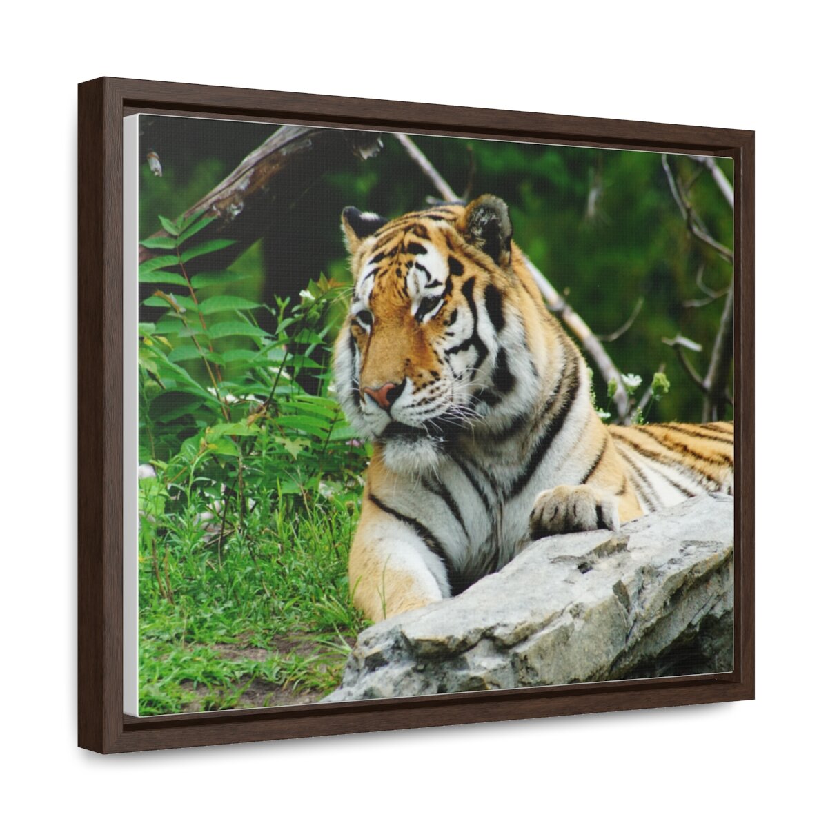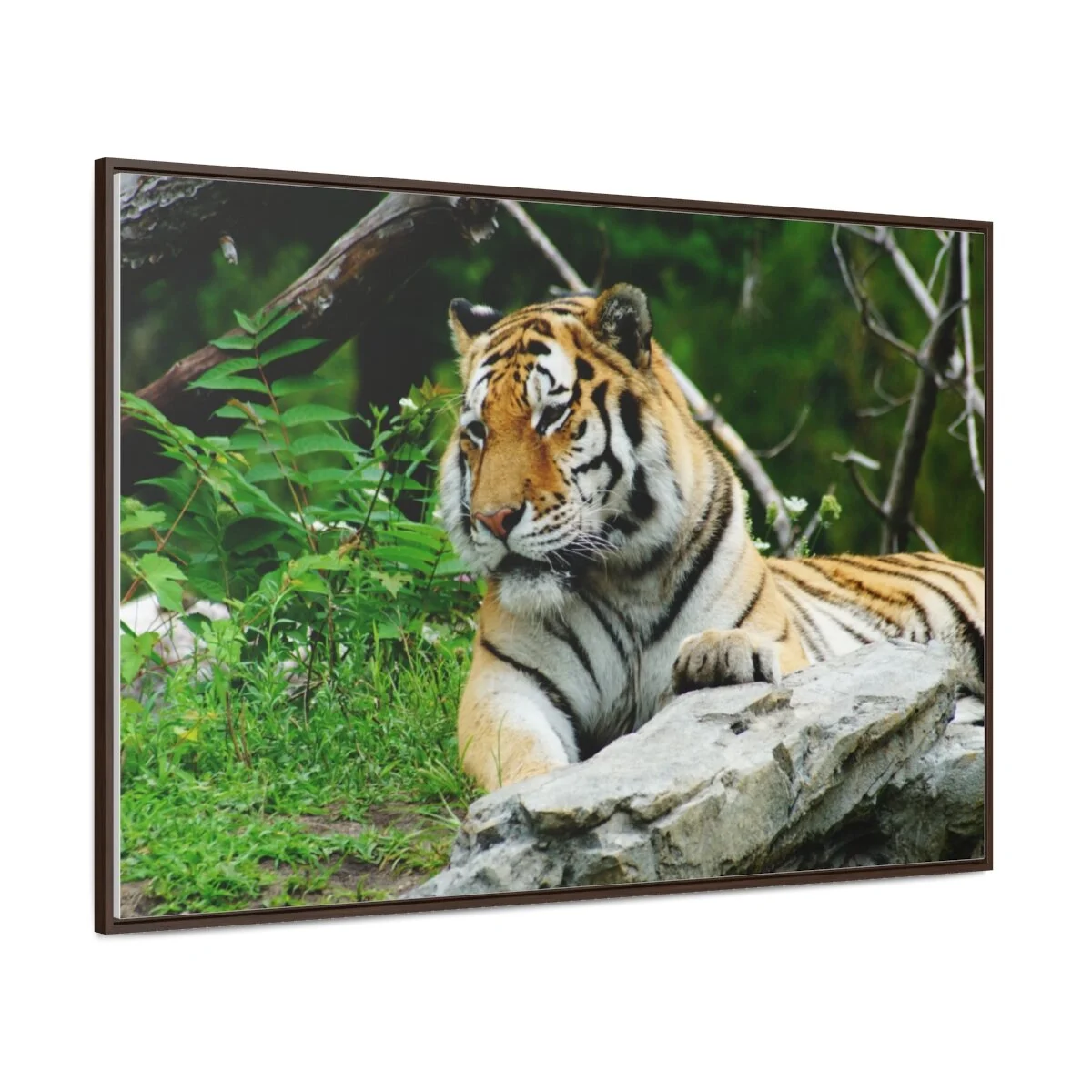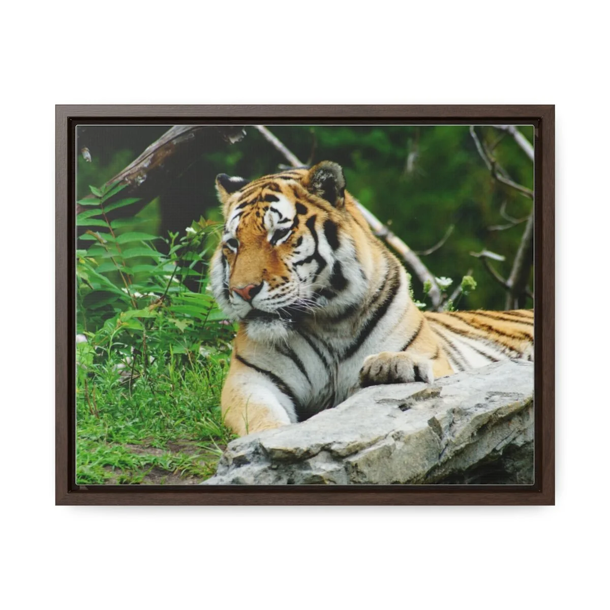 There are times when the subject, the light and the moment come together to make a great photograph. The Tiger Photo is one of those times. This image will captivate attention and add a colorful decorative element to any room. This horizontal gallery wrapped canvas print will always look as tight and flat as the day it was made. Every frame is built with a solid face to support the canvas and prevent deforming. Available in multiple sizes, comes in walnut and black frame options.
