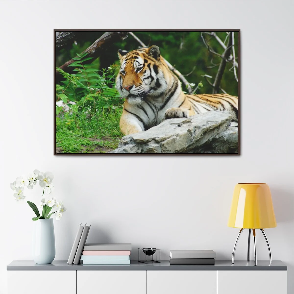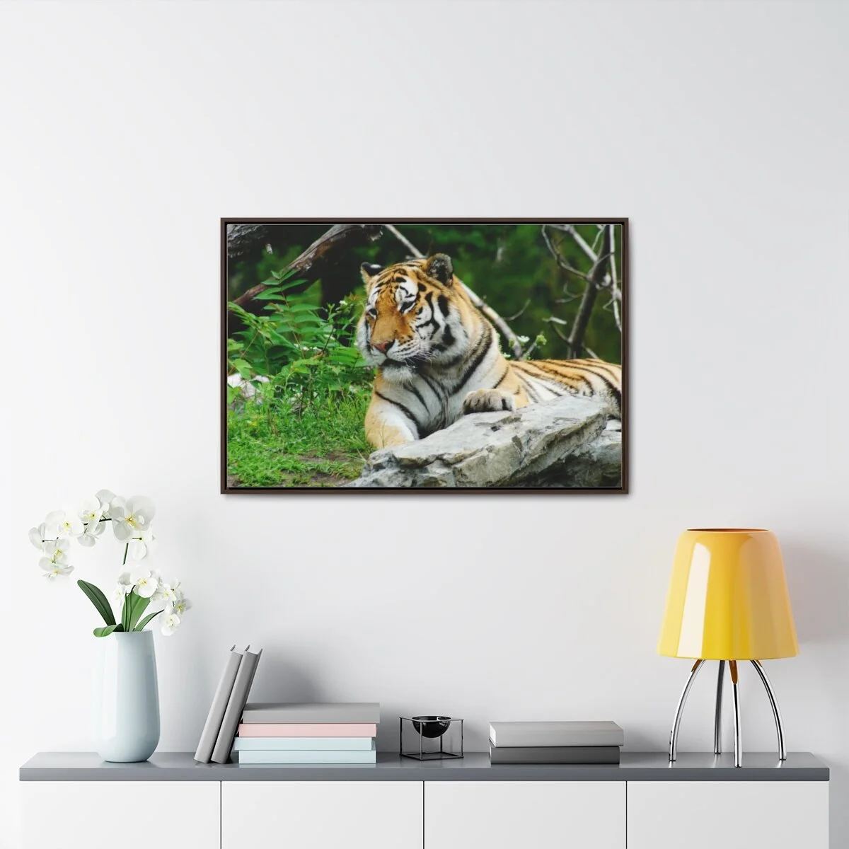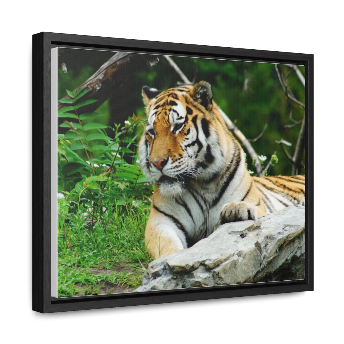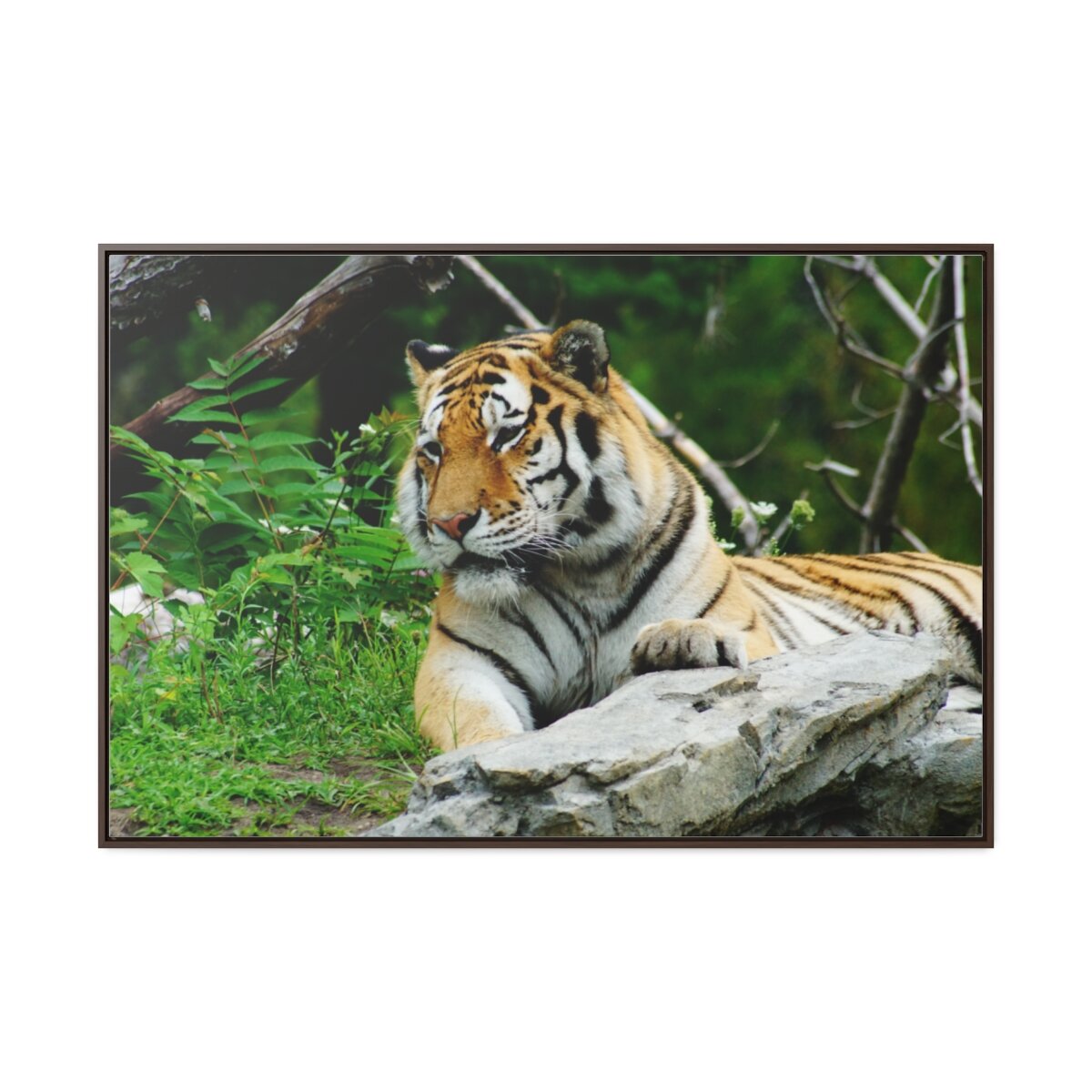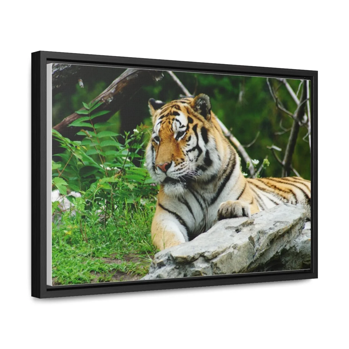 There are times when the subject, the light and the moment come together to make a great photograph. The Tiger Photo is one of those times. This image will captivate attention and add a colorful decorative element to any room. This horizontal gallery wrapped canvas print will always look as tight and flat as the day it was made. Every frame is built with a solid face to support the canvas and prevent deforming. Available in multiple sizes, comes in walnut and black frame options.