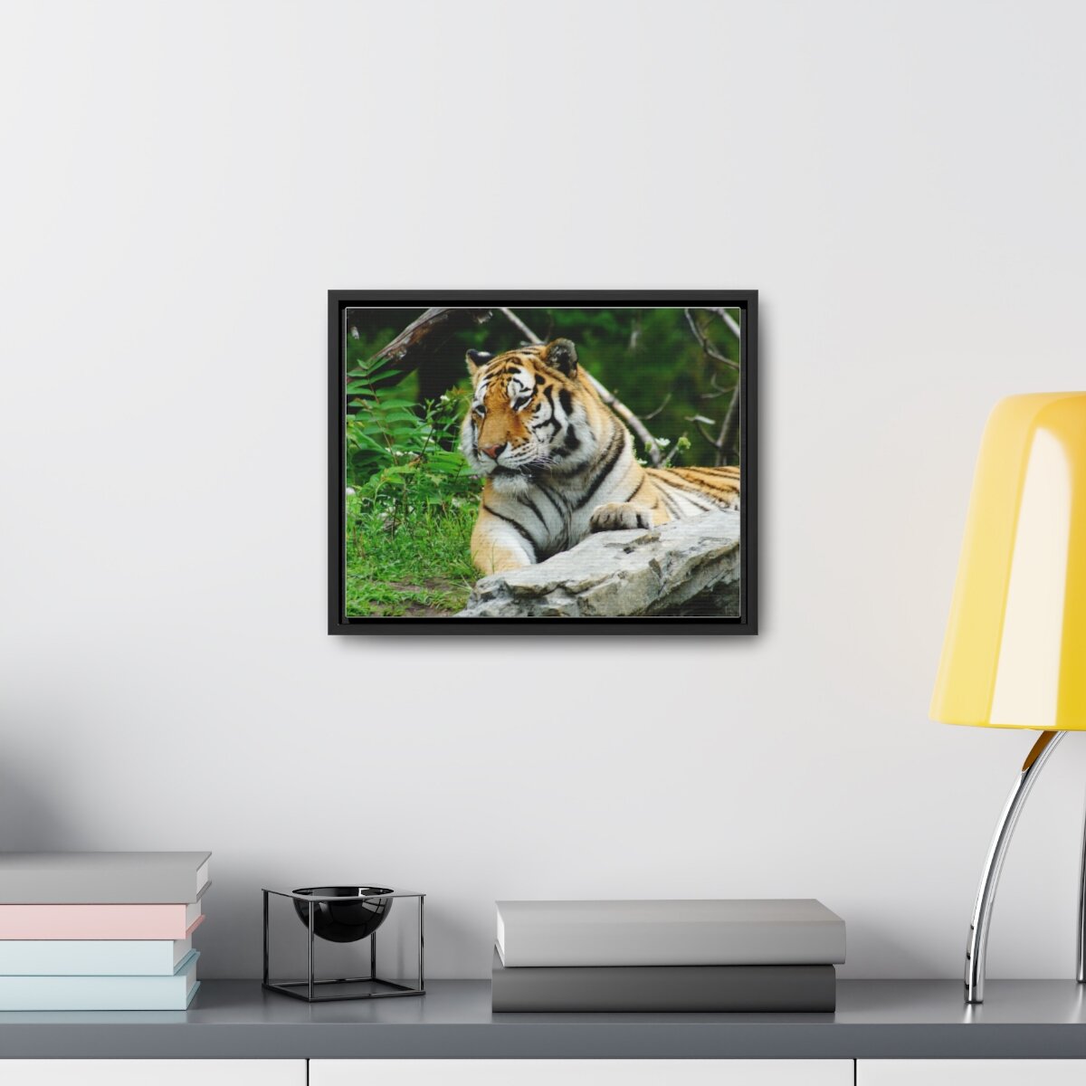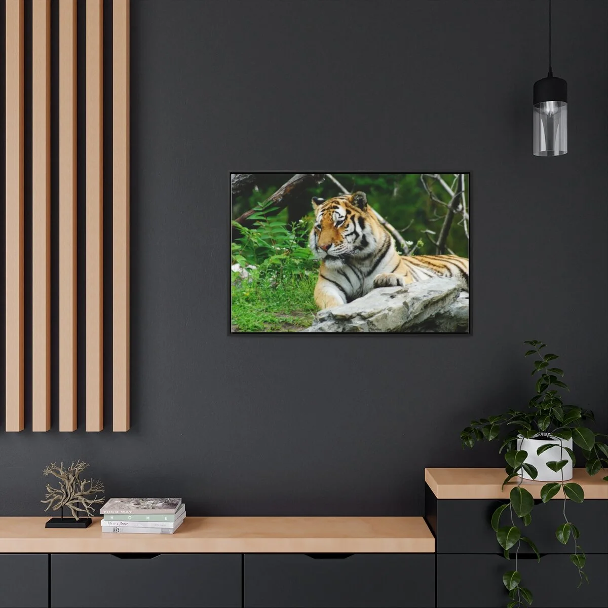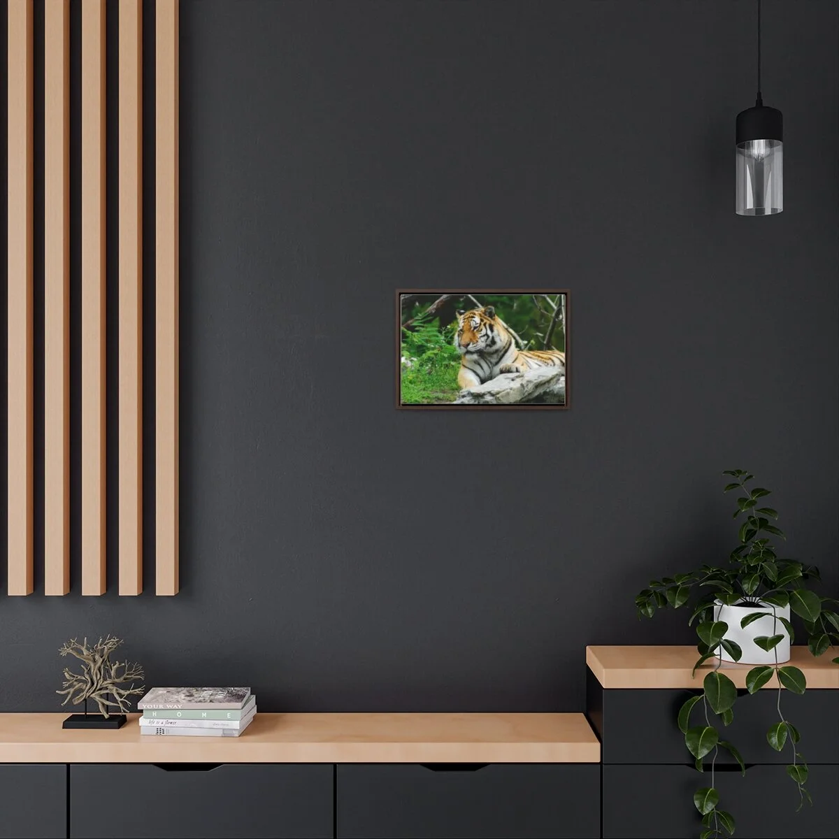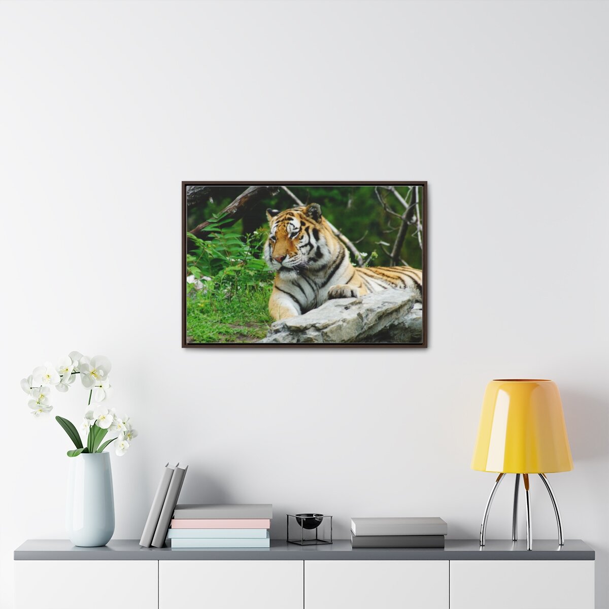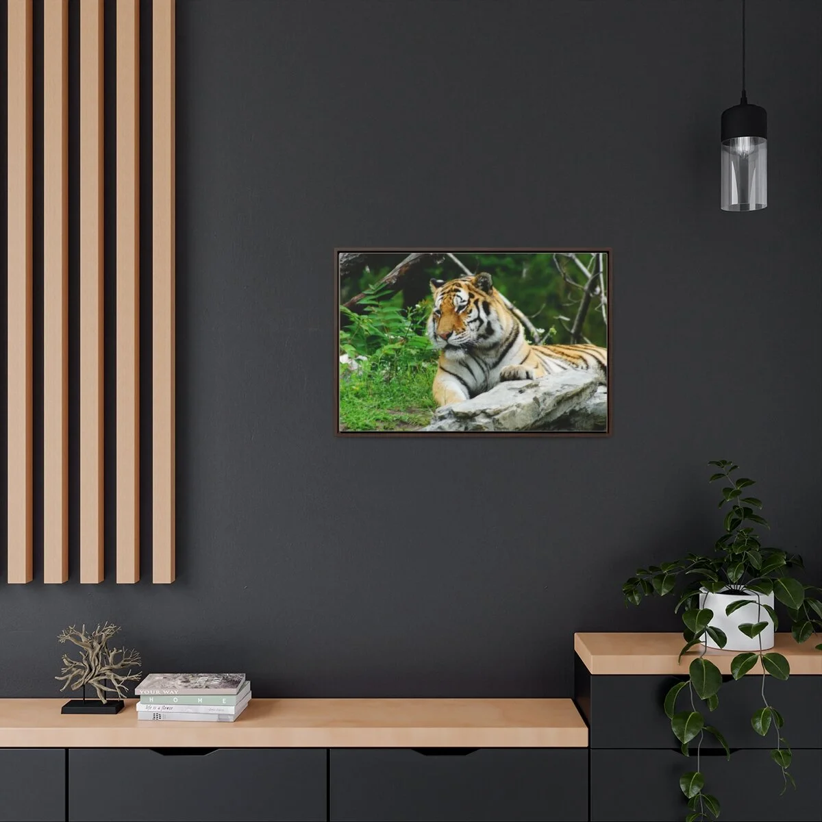 There are times when the subject, the light and the moment come together to make a great photograph. The Tiger Photo is one of those times. This image will captivate attention and add a colorful decorative element to any room. This horizontal gallery wrapped canvas print will always look as tight and flat as the day it was made. Every frame is built with a solid face to support the canvas and prevent deforming. Available in multiple sizes, comes in walnut and black frame options.
