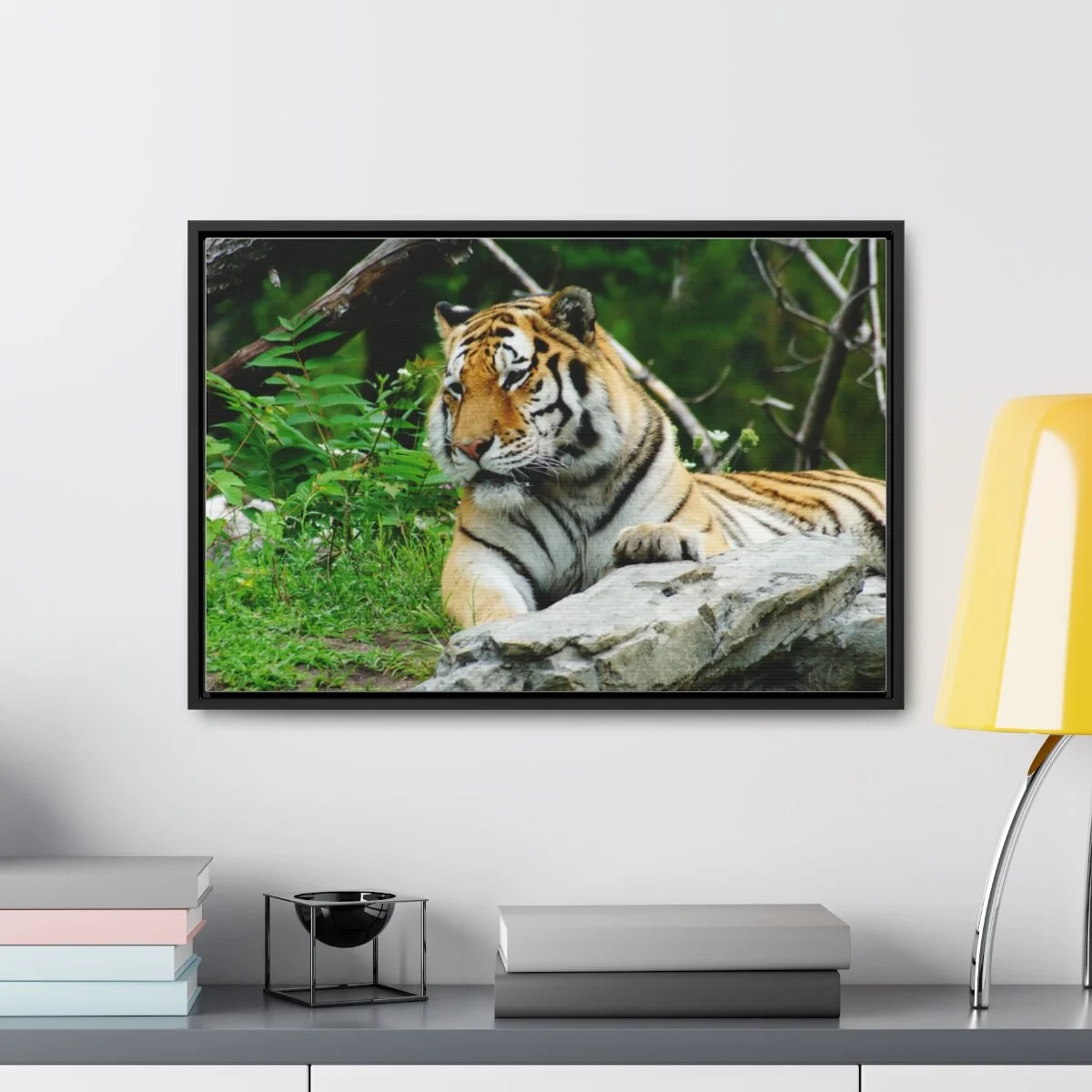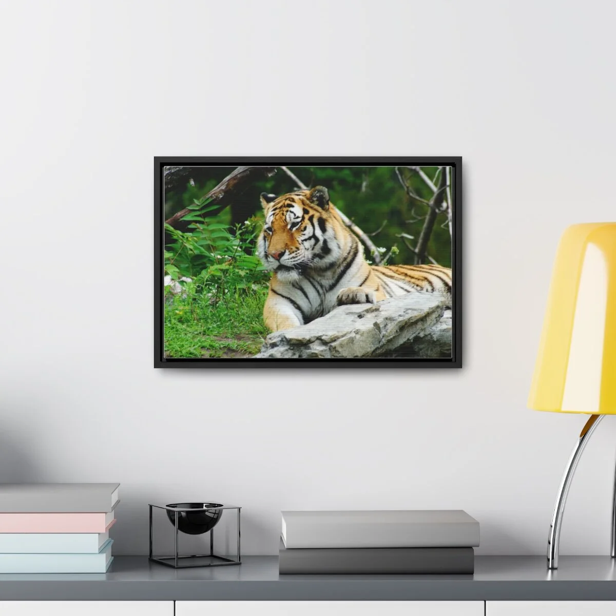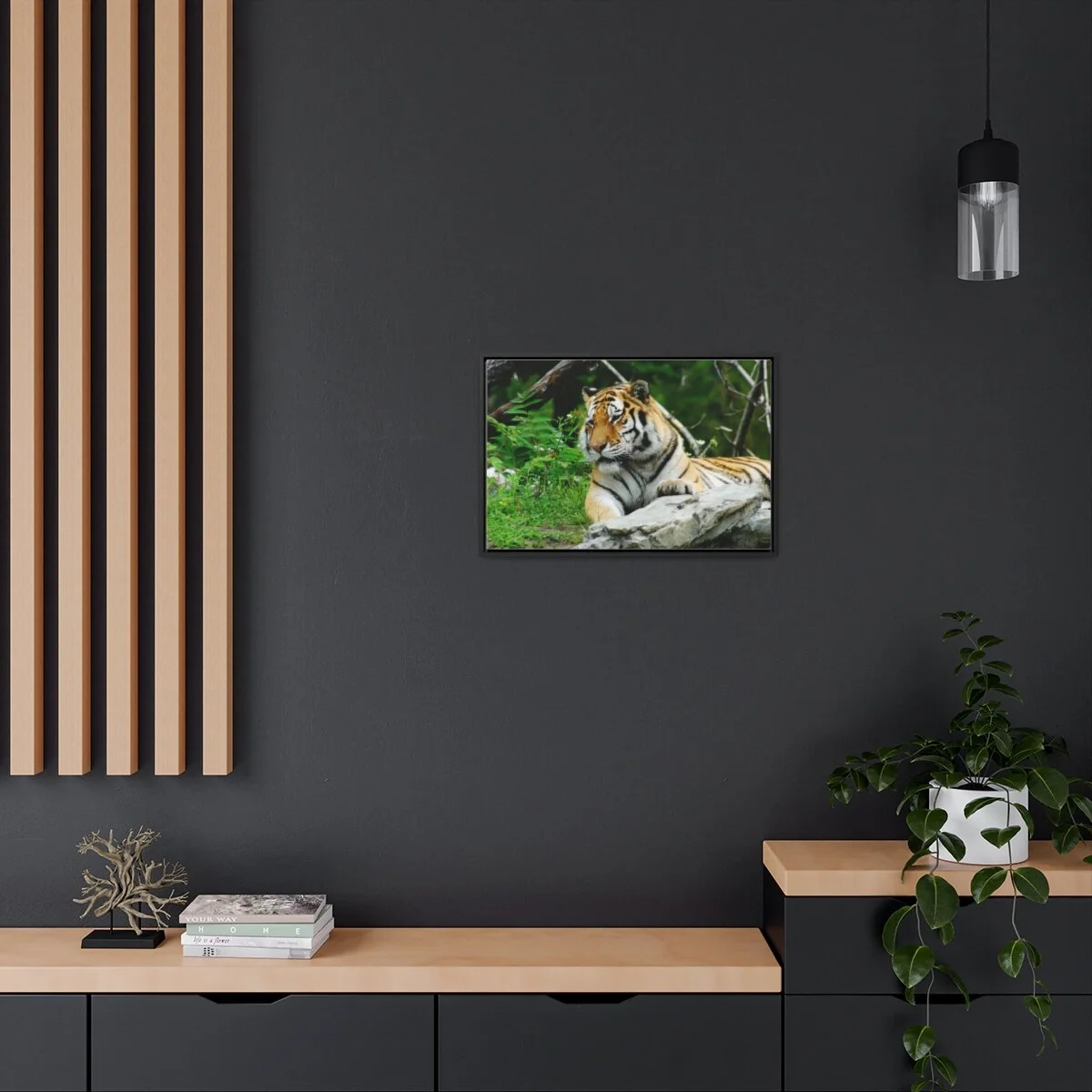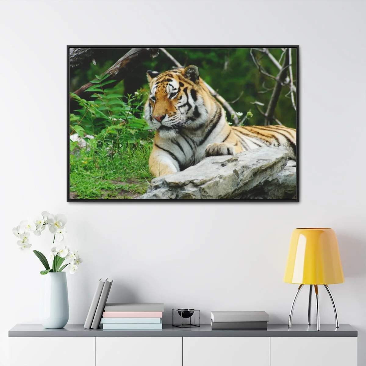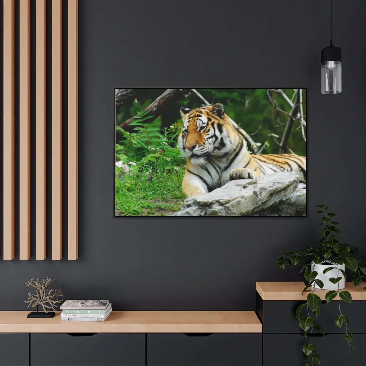 There are times when the subject, the light and the moment come together to make a great photograph. The Tiger Photo is one of those times. This image will captivate attention and add a colorful decorative element to any room. This horizontal gallery wrapped canvas print will always look as tight and flat as the day it was made. Every frame is built with a solid face to support the canvas and prevent deforming. Available in multiple sizes, comes in walnut and black frame options.